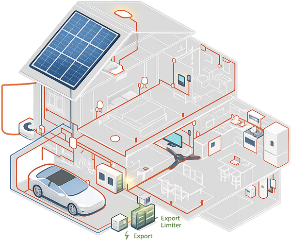 A complete solar PV system typically includes solar panels, an inverter, battery storage, a generation meter, and — where required — an export limiter.